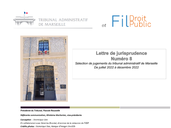 La lettre de jurisprudence du tribunal administratifs de Marseille a pour but de faire connaître non seulement aux spécialistes de droit administratif (avocats, services contentieux des collectivités publiques, universitaires) mais aussi à un public plus large (élus, membres d'associations ou de syndicats, étudiants ou tous citoyens à la recherche d'informations) les principaux jugements rendus par cette juridiction.